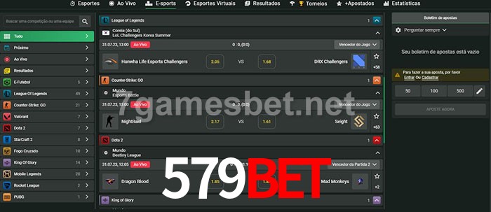 O 579Bet oferece uma grande seleção de opções de apostas em e-sports com probabilidades competitivas